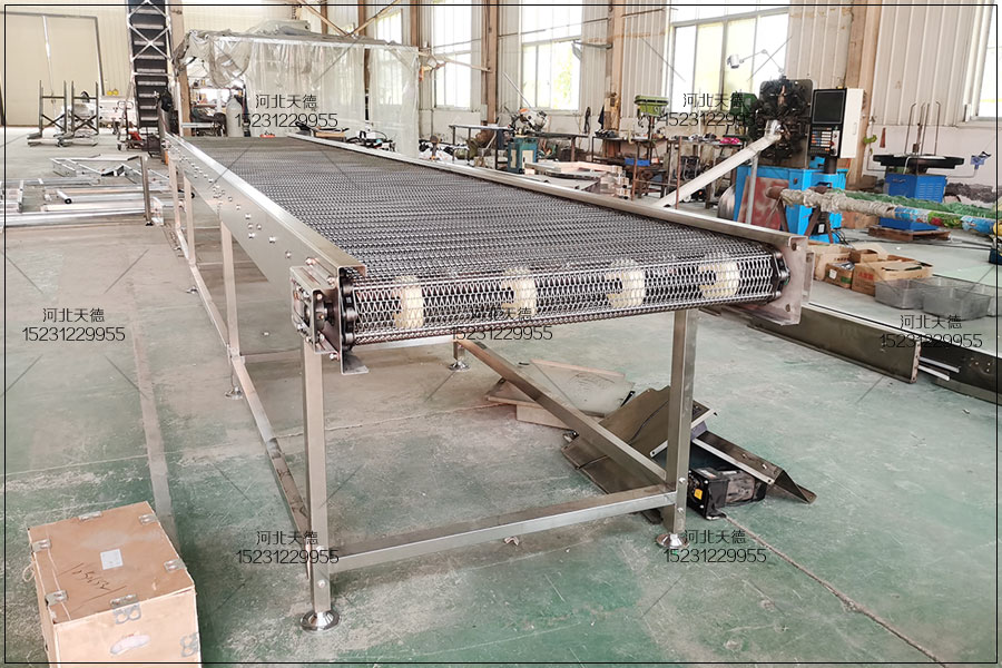 帶有糾偏裝置能自動檢測出膠帶運轉的趨勢,隨時進行糾偏報警,防止物 料輸送偏離生產線另外,根據輸送產品的工藝要求,可以是單個的傳送,也能是多個組成或與其他輸送設備組成水平與傾斜的輸送系統,明顯的提高整機的連續化生產效率。 網鏈輸送機選擇使用不銹鋼網帶作為載體,用來輸送多種形式的食品加工行業的烘干、去濕、冷凍等、熱處理等,同時不銹鋼板或者絲制成,具有耐高溫好清洗等特點 。 知道在食品生產加工過程中,要選用不同形式的平板鏈,可達到平面輸送、平面轉彎、提升下降等各種功能,實現食品加工企業多樣式輸送的要求。