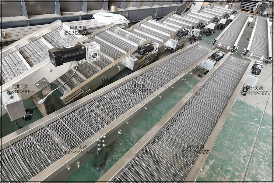 (3)鋼絲網(wǎng)帶 鋼絲網(wǎng)帶強度高,耐高溫。它具有網(wǎng)孔,網(wǎng)孔的大小可按需要選擇,多用于一邊輸送一邊固液分離的場合。如油炸食品爐中的物料輸送,水果洗滌設備中的水平輸送等常采用鋼絲網(wǎng)帶。鋼絲網(wǎng)帶用于烘烤食品設備中時,由于網(wǎng)帶網(wǎng)孔能透氣,故烘烤時食品生坯底部水分容易蒸發(fā),其外形不會因脹發(fā)而變得不規(guī)則或發(fā)生油灘、洼底、粘帶及打滑等現(xiàn)象。網(wǎng)帶上積累的面屑碳黑不易清洗,致使制品底部粘上黑斑而影響食品質(zhì)量。應對網(wǎng)帶涂鍍防粘材料來解決。